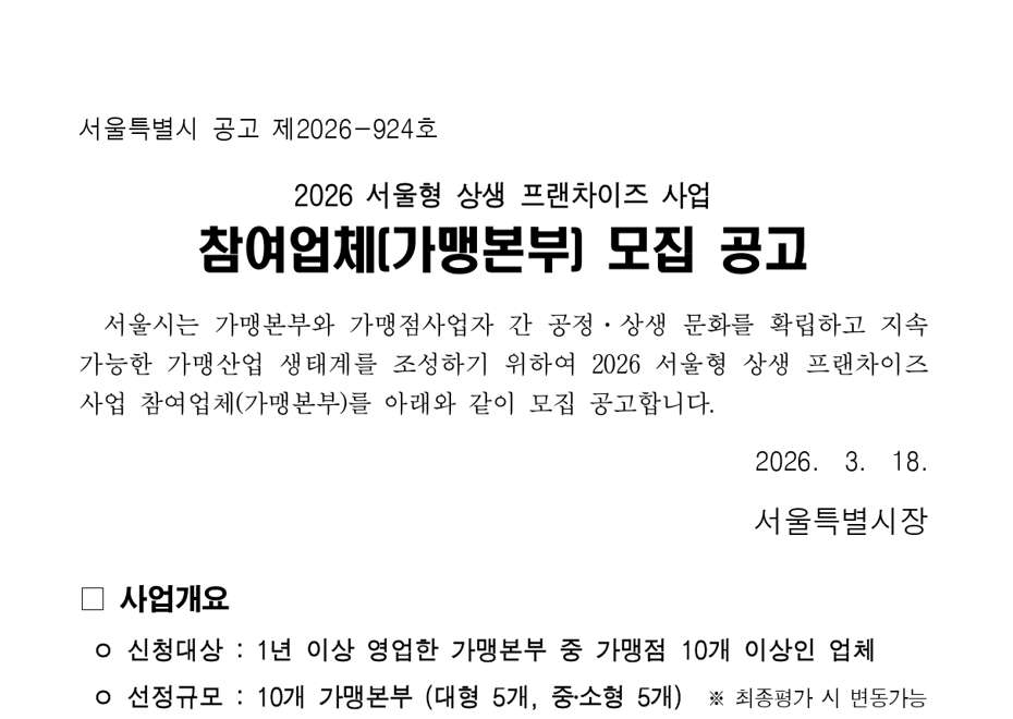 [서울시] 2026 서울형 상생 프랜차이즈 사업 안내(~5/22)